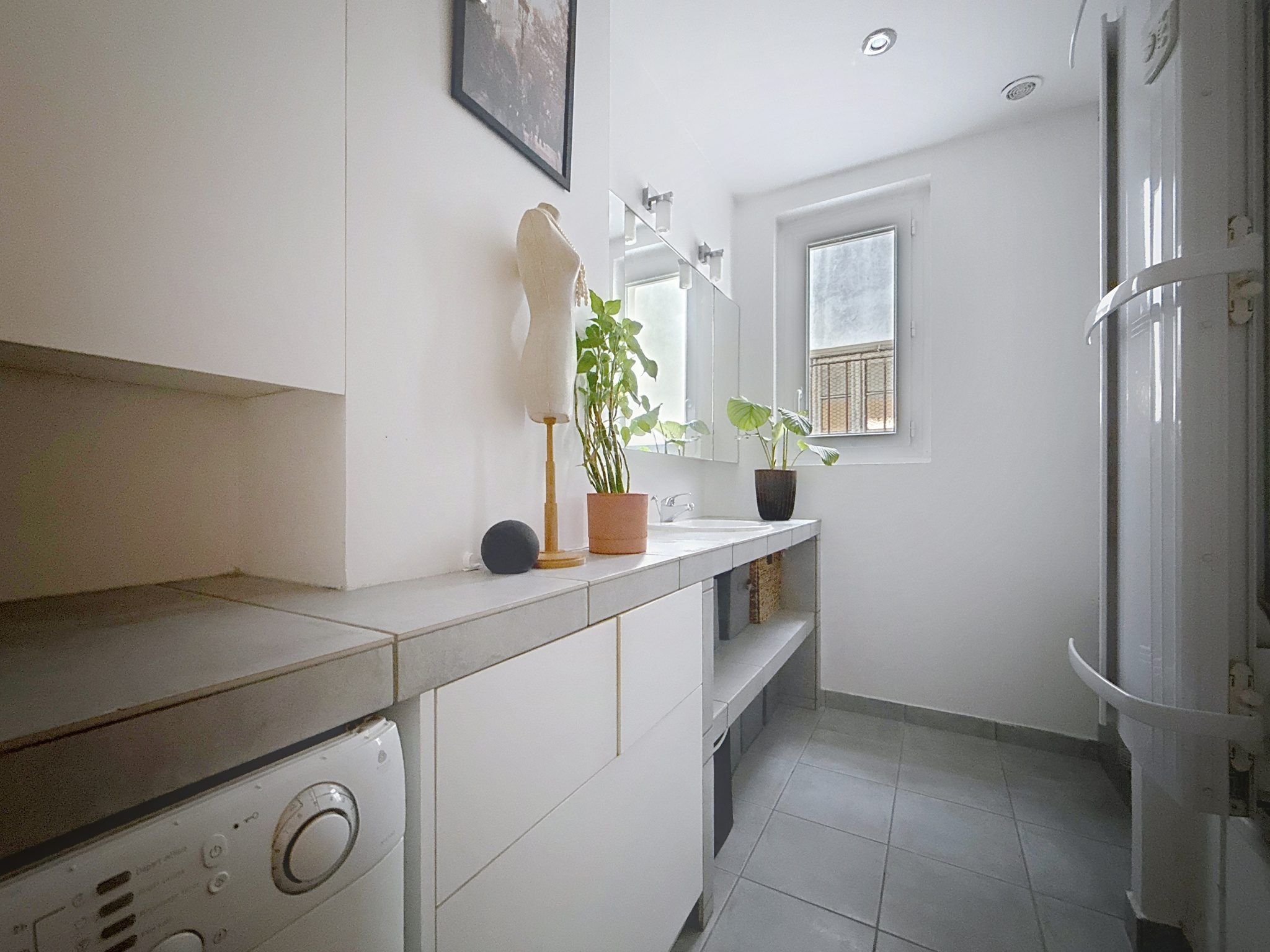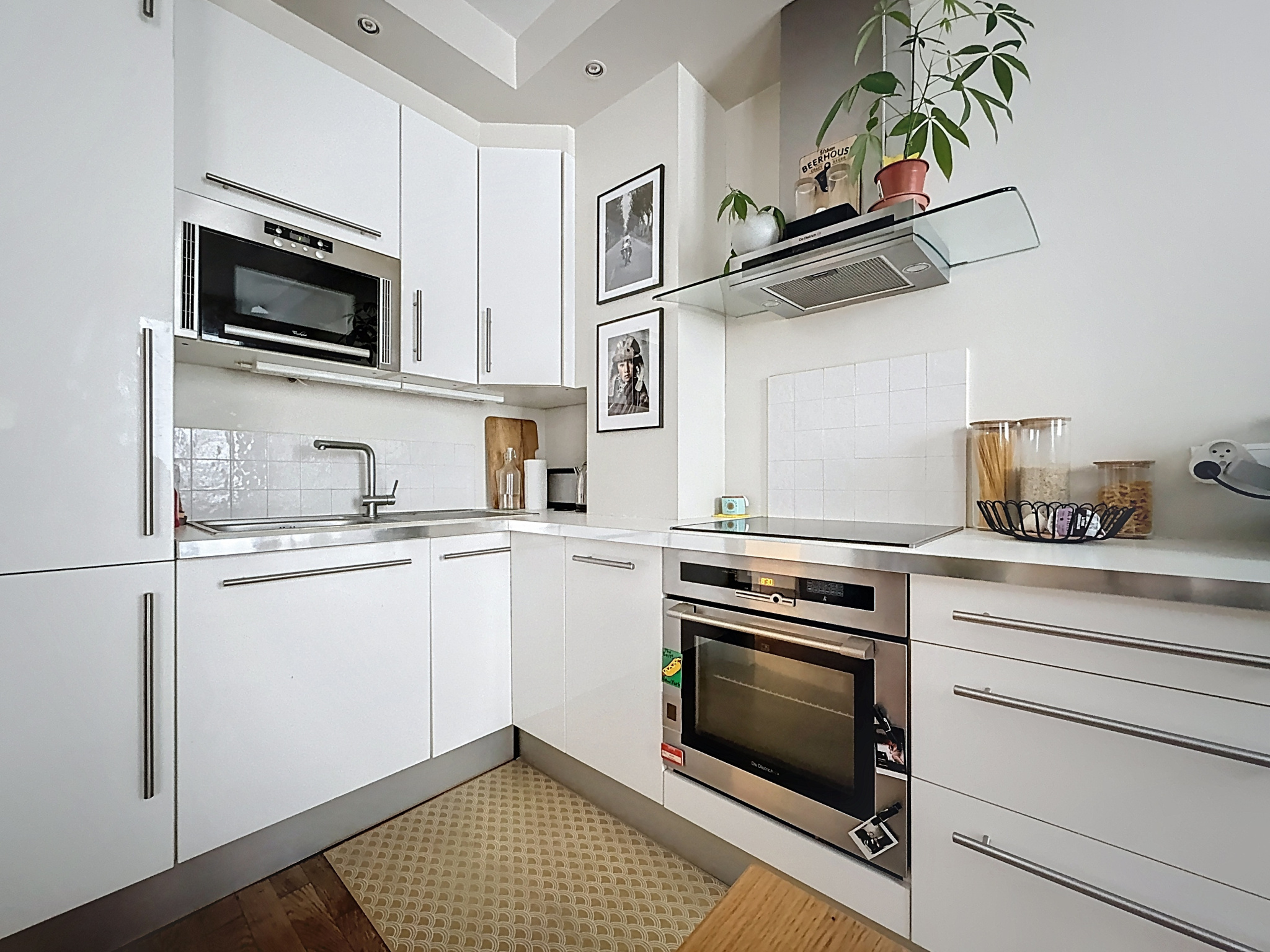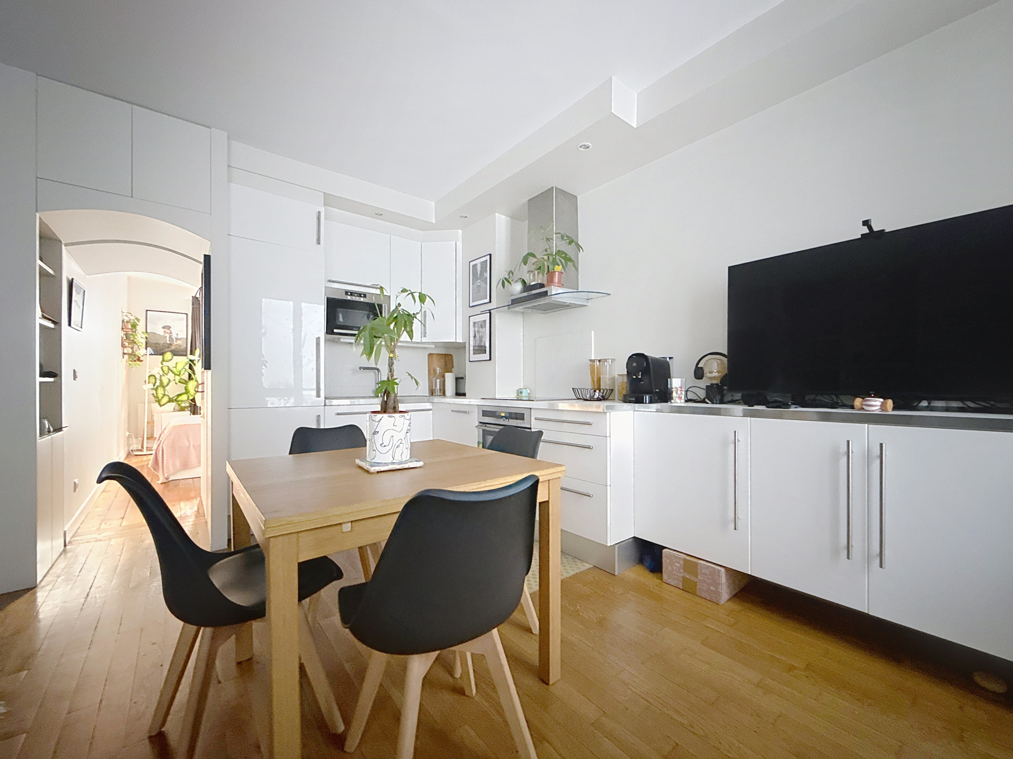 L’appartement, rénové par architecte, se compose d’une entrée optimisée avec de très nombreux rangements, d’un séjour avec cuisine ouverte aménagée, d’une chambre avec coin bureau et rangements, d’une salle de bain avec 2 fenêtres et d’un WC indépendant.