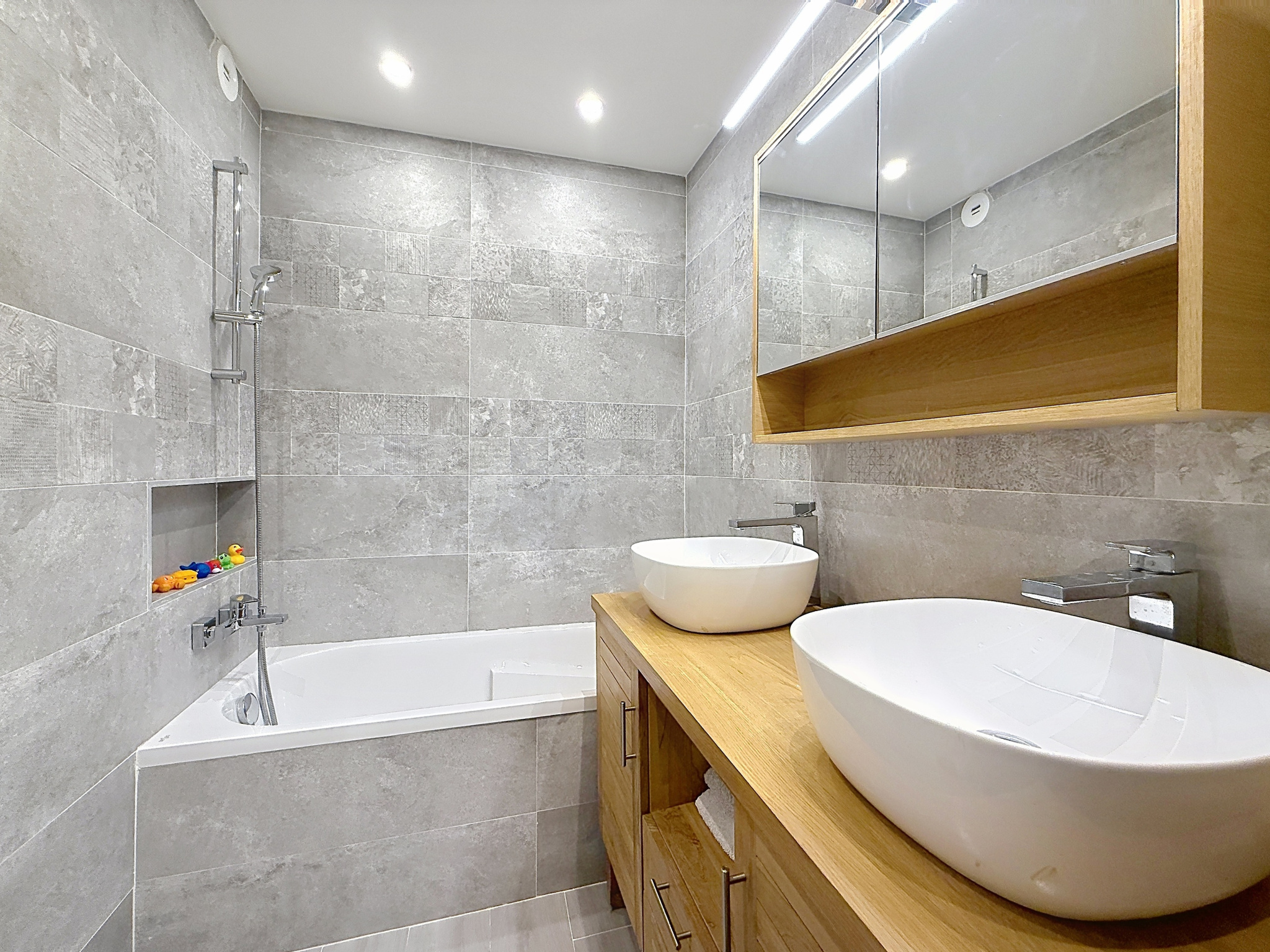 En rez-de-jardin, au calme absolu, dans la cour d’un immeuble récent, cet appartement (70,21 m2) comprend une entrée, un séjour ouvrant sur l’extérieur, une cuisine séparée aménagée et équipée (cuisine US possible), deux chambres, une salle de bains avec douche, baignoire et WC, des WC séparés avec lave-mains. Une cave et un box complètent ce bien.