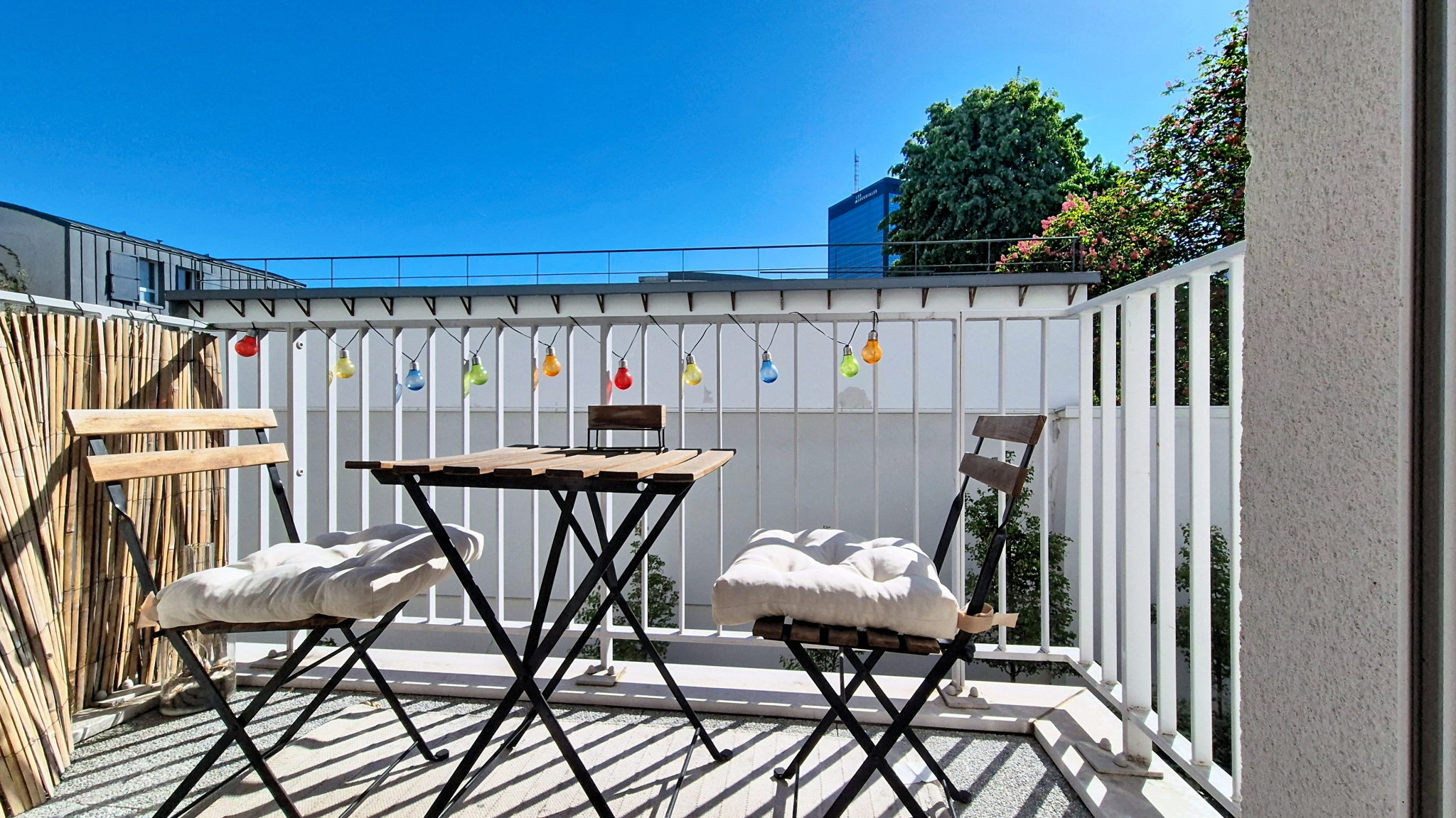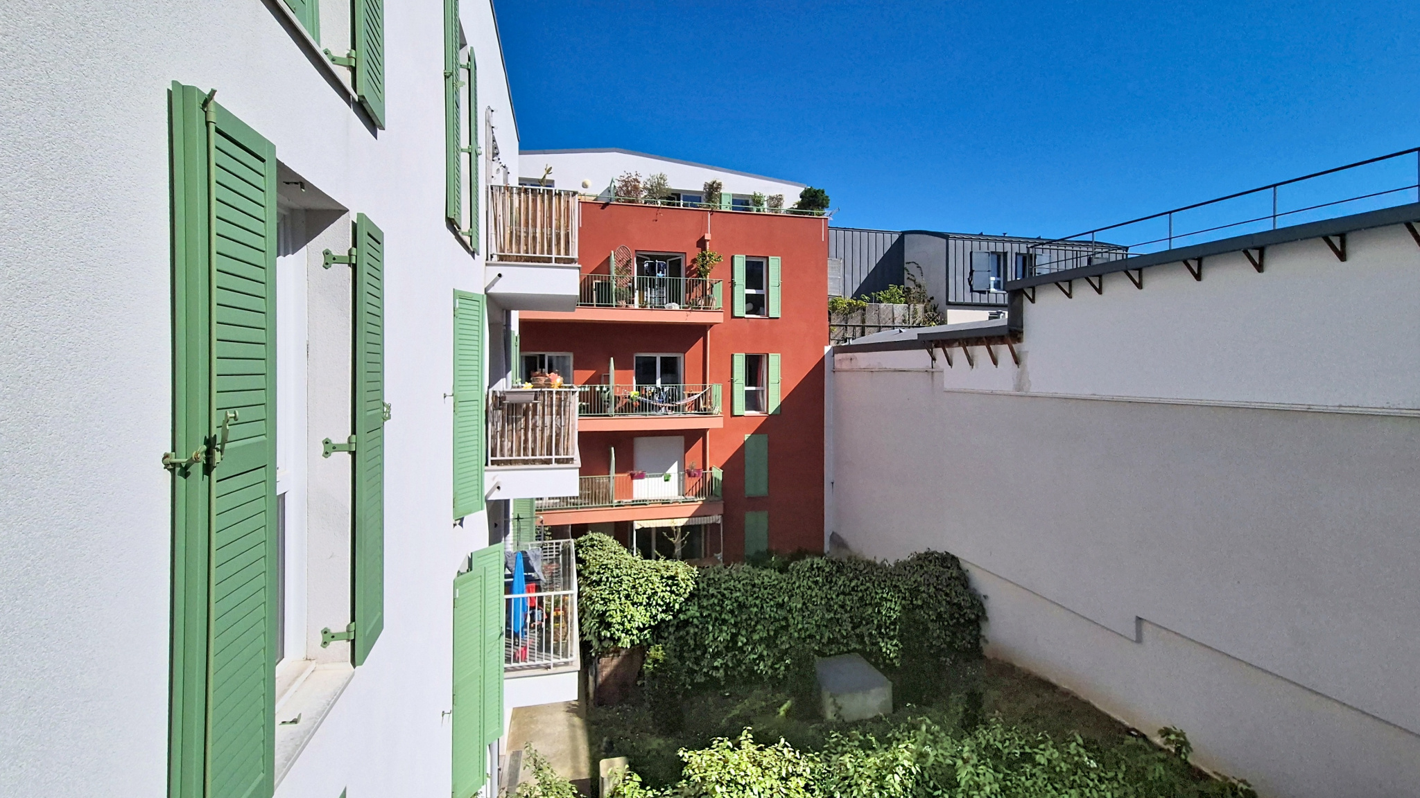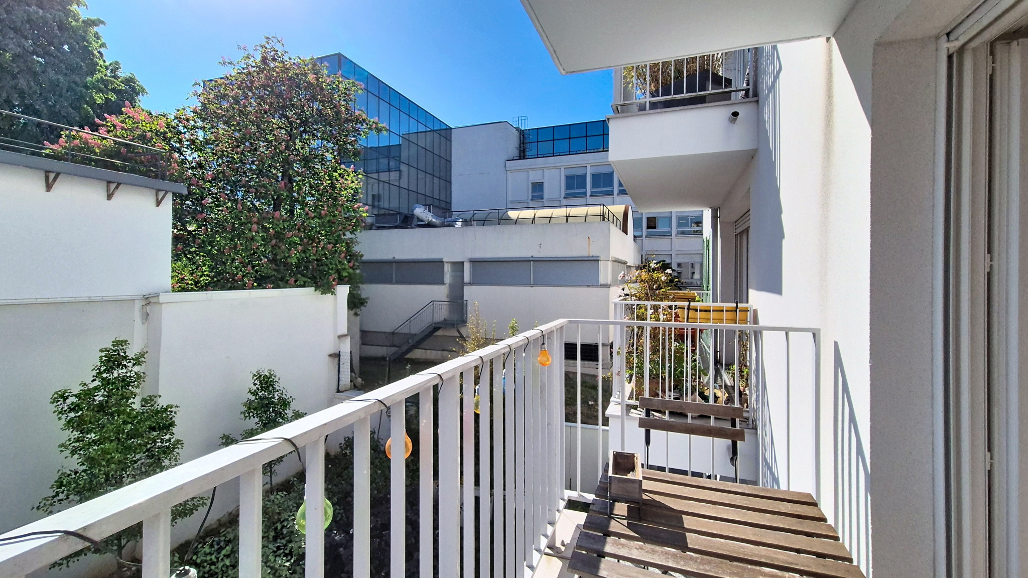 -Une pièce à vivre avec placard intégré, ouvrant sur un balcon au calme absolu avec vue sur le jardin de la copropriété.