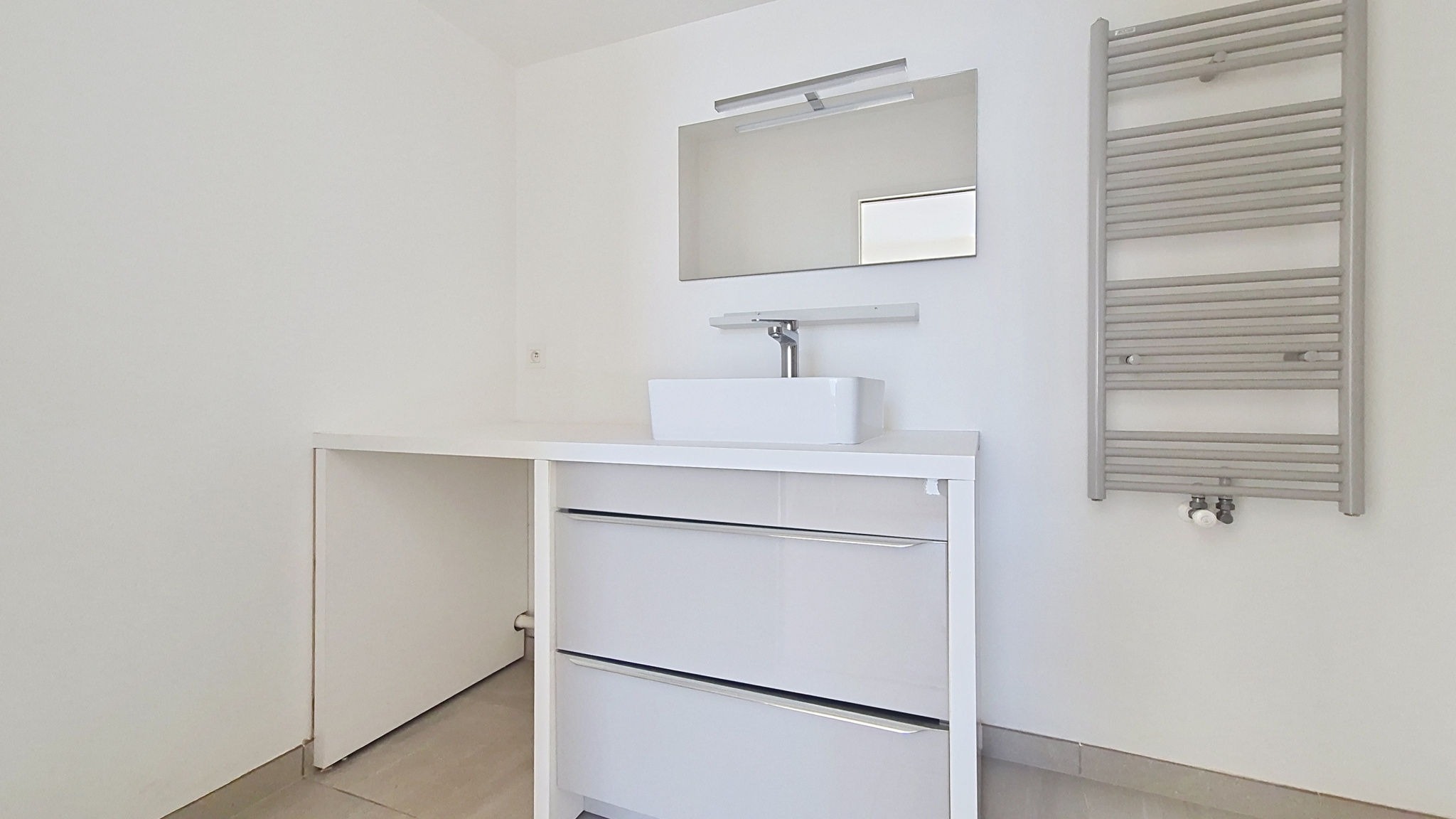 -Une salle d’eau avec grande douche, sèche-serviettes et emplacement pour lave-linge.
