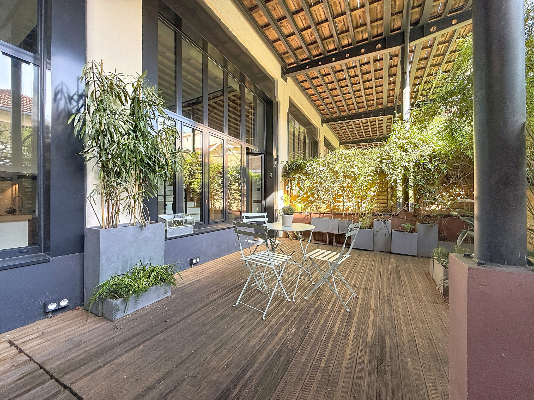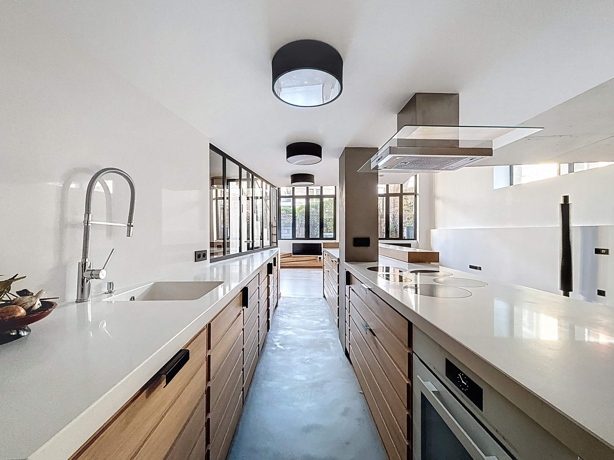 La hauteur sous plafond de 4,70 mètres, la verrière toute hauteur et les larges ouvertures confèrent à l’ensemble grandeur et caractère.