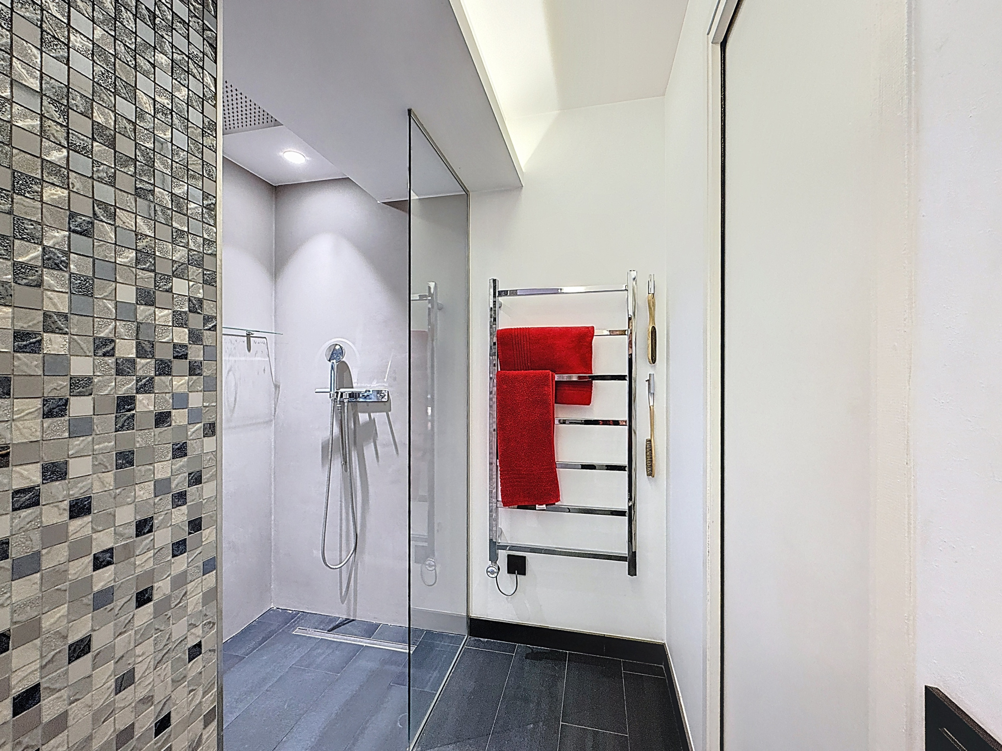 L’ensemble se distingue par la qualité remarquable des matériaux : menuiseries sur mesure, essences de bois sélectionnées, béton ciré, finitions haut de gamme, filtres isolants sur les vitrages pour le confort thermique été comme hiver.